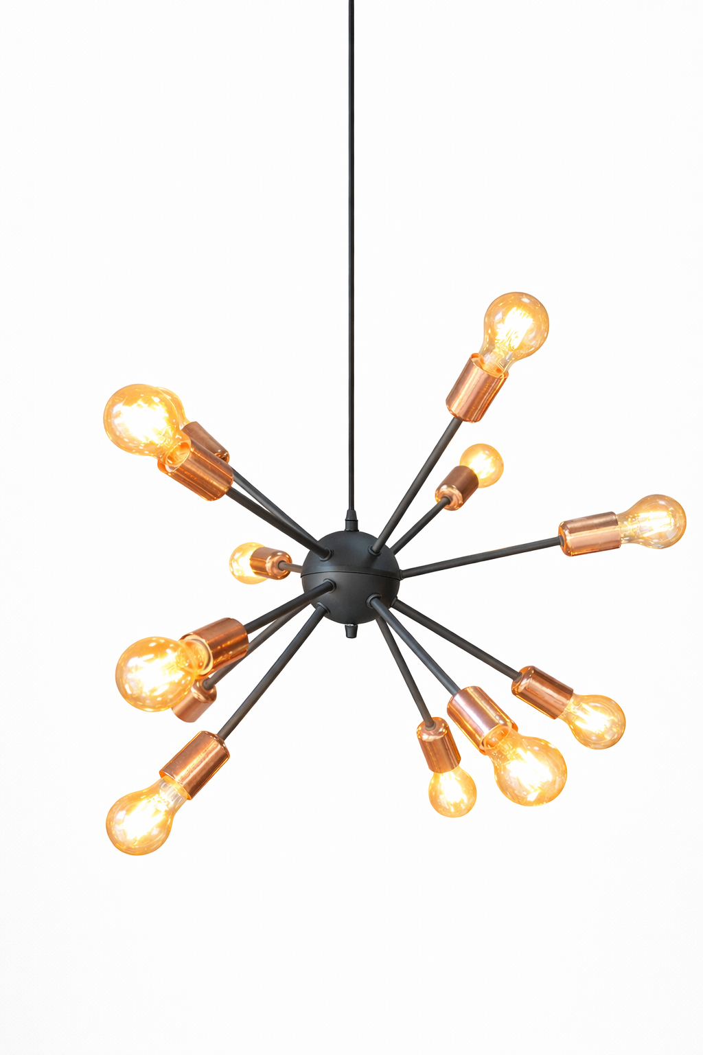 Esta lámpara de 10 brazos es una pieza protagonista que transforma cualquier espacio en un ambiente sofisticado y moderno. Su estructura metálica se extiende de forma equilibrada, creando un efecto visual impactante desde todos los ángulos, mientras que sus diez puntos de luz aportan una iluminación amplia, cálida y envolvente.